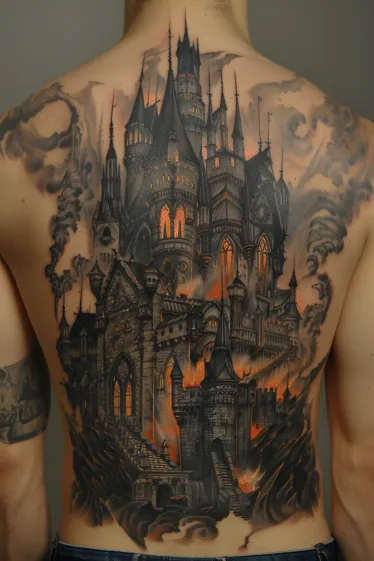 This tattoo is an absolute masterpiece, turning the entire back into a breathtaking medieval scene. The gothic-style castle, with its towering spires and intricate stonework, feels like it belongs in an ancient legend. The glowing orange windows add an eerie yet magical contrast against the dark, smoky shading, making it seem like the castle is alive with flickering torchlight. The depth in the architecture, from the winding staircases to the crumbling battlements, creates a sense of mystery and grandeur, as if this fortress holds centuries of forgotten stories.