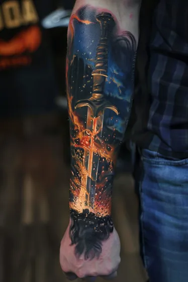 This one is beyond epic. The way the sword glows against the fiery background makes it feel like something straight out of a medieval legend. The bold use of color and contrast is just unreal, and I love how the light and shadows bring the metal to life. If you re looking for a tattoo that embodies strength, resilience, and a touch of magic, this is the ultimate statement piece.