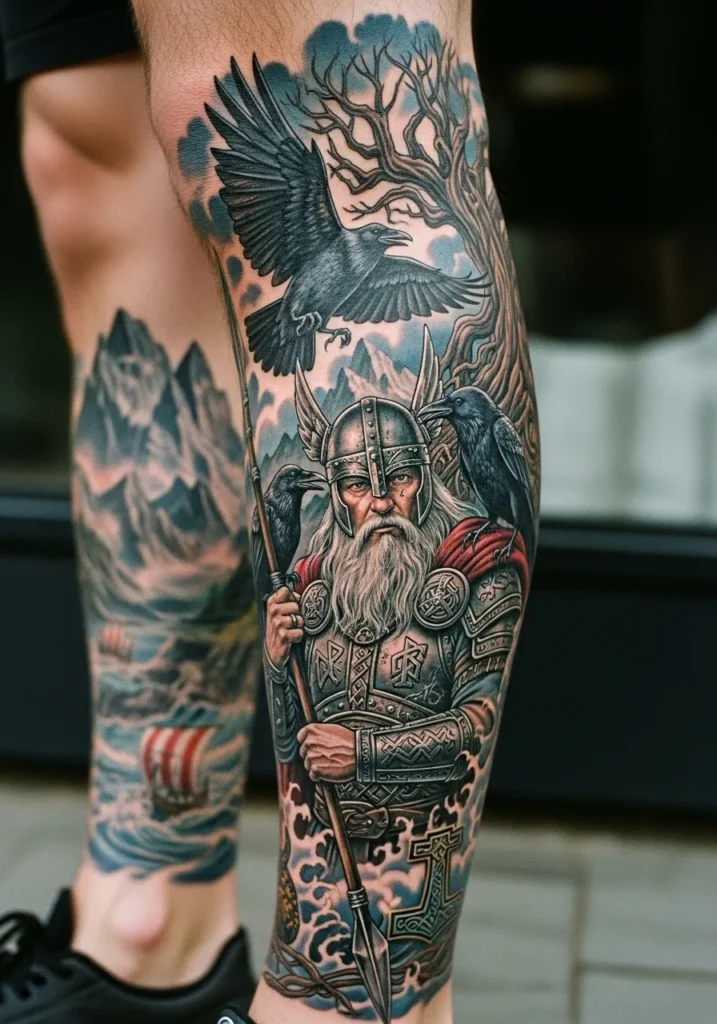 This epic realism tattoo brings Norse mythology to life. A bearded warrior god stands strong, flanked by two ravens and backed by a dramatic mountain and tree scene. Intricate armor, runes, and stormy skies add layers of depth and mystery. The cool blue-gray tones contrast beautifully with touches of red and gold, giving the artwork a mythic presence.