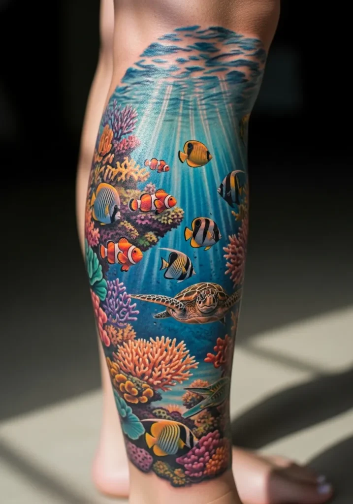This underwater scene transforms the leg into a tropical reef full of life. Bright coral, colorful fish, and a serene sea turtle float under shimmering rays of sunlight filtering through the surface. The tattoo s use of gradients and contrast creates a glowing effect that feels almost three-dimensional.