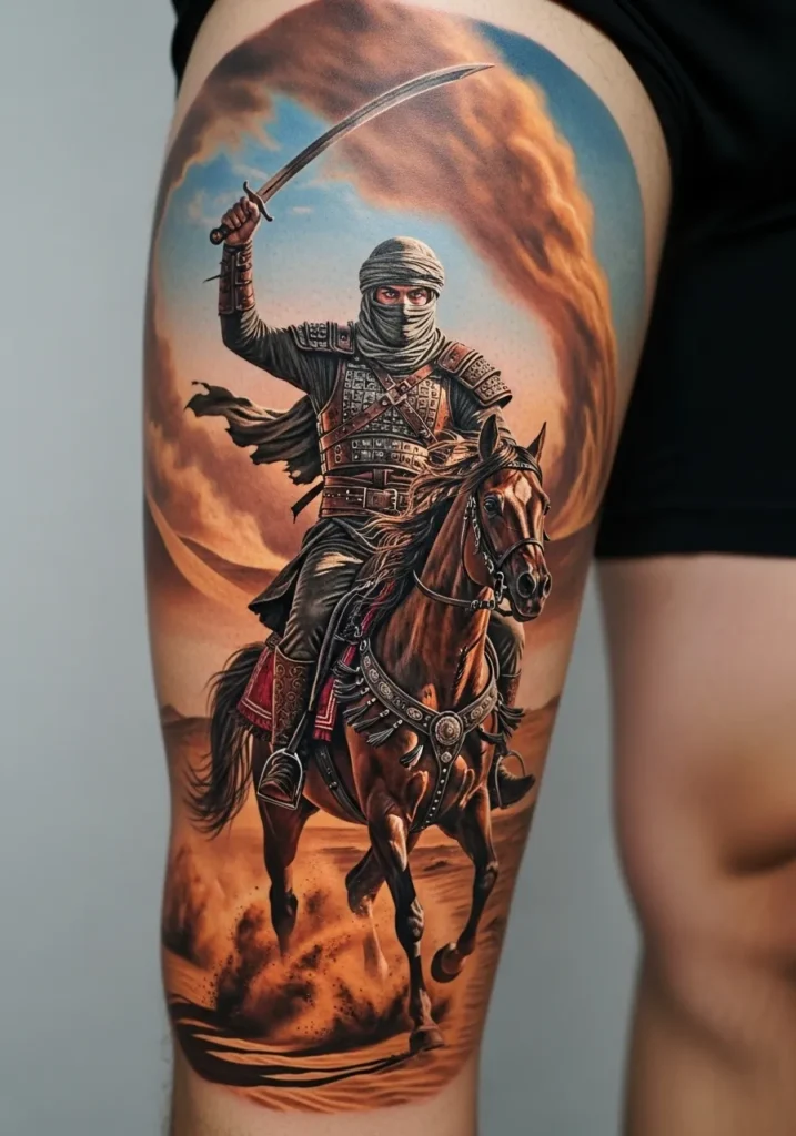 This powerful realism tattoo portrays a desert warrior on horseback, sword raised high as sand swirls around him. The warm tones of copper, gold, and burnt orange create a cinematic glow, while the movement of the horse and the folds of fabric bring the piece to life. It flows naturally across the thigh and knee, commanding attention.