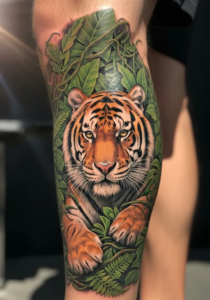 This vivid realism piece showcases a tiger emerging through dense jungle leaves, its golden fur glowing under soft sunlight. The greens are rich and deep, framing the tiger s calm but intense gaze perfectly. Every whisker, leaf, and shadow adds to the tattoo s realism, creating the illusion of life just beneath the skin.