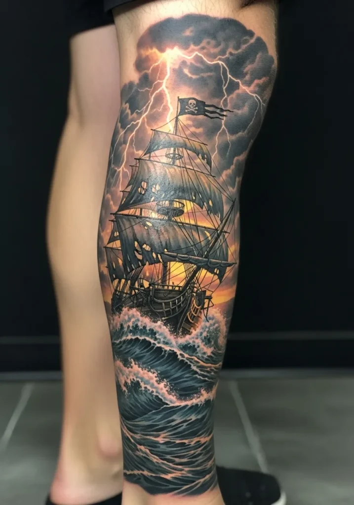 This dramatic leg sleeve showcases a pirate ship battling massive waves beneath lightning-filled skies. The glowing sunset behind the storm adds incredible contrast, painting the sails in warm orange light while the black flag whips in the wind. The movement in the waves and the crackling energy of the storm make the scene feel alive and fierce.