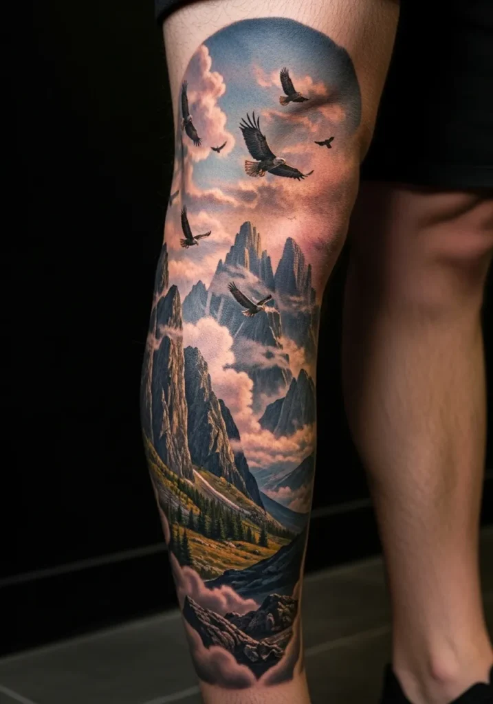 This breathtaking tattoo stretches from calf to thigh, showcasing towering mountains surrounded by drifting clouds and soaring eagles. The soft pink and blue tones of the sky create a tranquil yet adventurous mood, while the shading gives incredible dimension to the rocky cliffs and misty air.