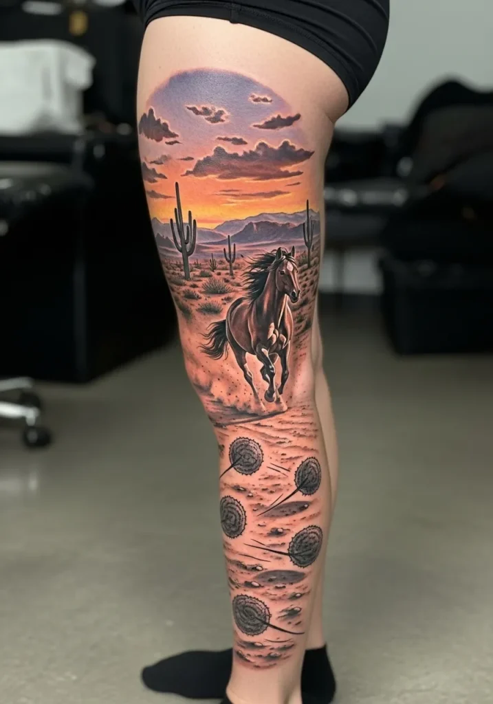 This leg sleeve brings the wild west to life with a galloping horse racing across a sunlit desert. Warm oranges and purples fill the sky as cacti and mountains frame the scene. Dust clouds swirl beneath the horse s hooves, creating an incredible sense of movement that flows beautifully along the leg.