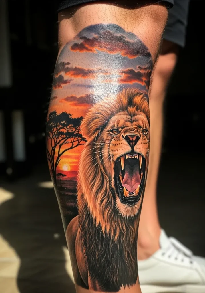 This roaring lion tattoo bursts with vivid color and emotion. The artist created an African savannah sunset across the calf, with the golden-orange sky blending into deep shadows beneath the lion s mane. Every detail, from the reflection in the lion s eyes to the glowing horizon, captures raw energy and warmth.