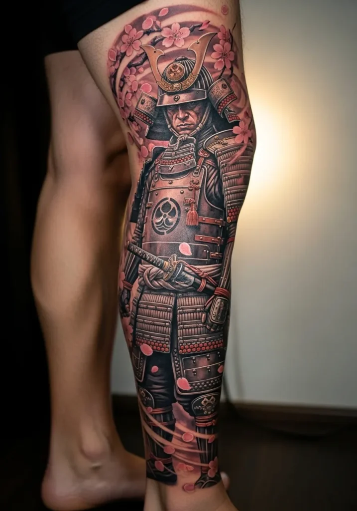 This full leg sleeve commands attention with a strikingly realistic samurai warrior standing amidst soft pink cherry blossoms. The intricate armor, complete with metallic reflections and detailed engravings, stretches from thigh to ankle. The background glow enhances the depth and balance of the entire composition, giving it an almost cinematic feel.