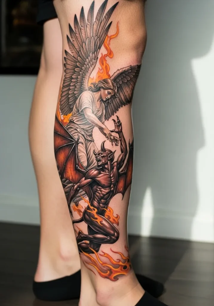 This design tells a story right on the skin an angel and demon locked in an intense clash surrounded by flames. The tattoo stretches along the entire leg, with the angel s wings arching upward and the demon s fiery form twisting below. The soft whites and golds of the angel contrast beautifully with the burning reds and blacks of the demon, creating an unforgettable balance of light and dark.
