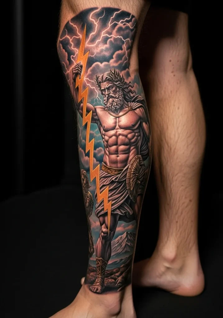 This tattoo showcases Zeus, the god of thunder, wielding a glowing bolt of lightning against a stormy sky. His muscular form and flowing beard are detailed with masterful realism, while the electricity cuts through clouds in vivid yellows and blues. The power and movement wrap around the leg in an intense, mythic way.