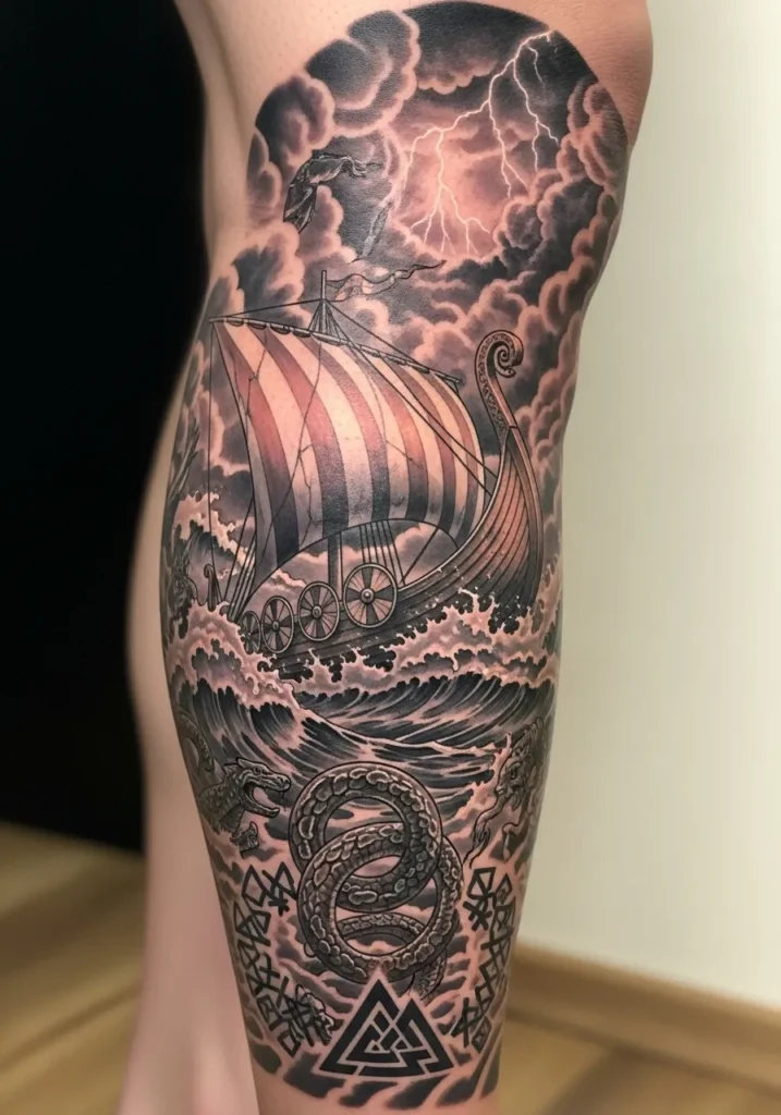 This stunning leg sleeve captures the fury of the sea with a Viking ship battling waves beneath stormy skies. Lightning cracks through the clouds while Norse runes and a coiled serpent twist below the ship, giving the entire piece a sense of motion and power. The muted tones of gray and rose create incredible depth, wrapping the leg with mythic energy.
