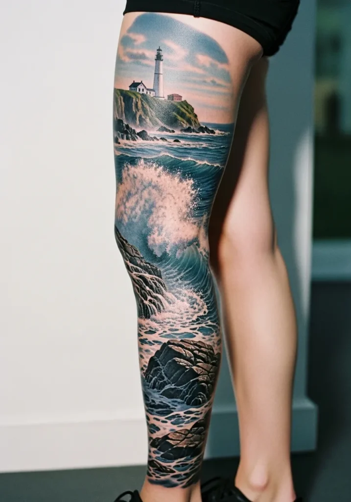 This tattoo captures the serenity and strength of the sea. A lighthouse stands tall on a rocky cliff while waves crash below, bursting in frothy white against deep blue water. The soft pastel sky above creates a calming balance that brings the whole scene to life with realistic movement and color blending.