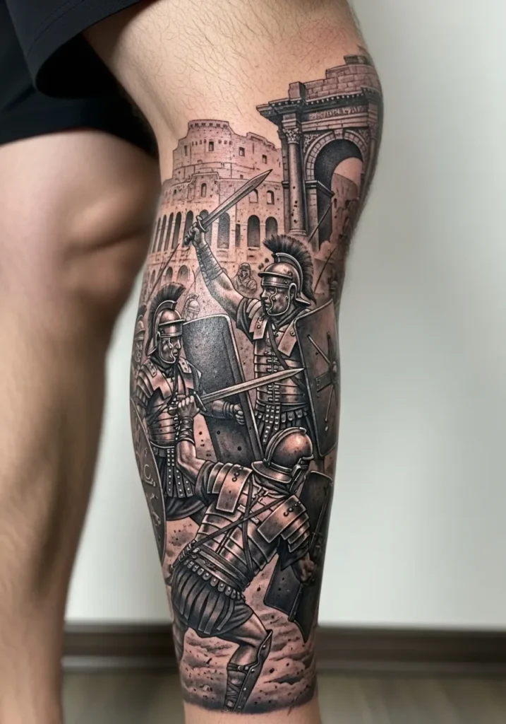 This masterpiece brings ancient Rome to life with soldiers mid-battle, swords clashing before the Colosseum. Every element from the armor s reflections to the dust rising around them is captured with breathtaking precision. The grayscale tones emphasize depth and realism, creating a tattoo that feels alive with motion.