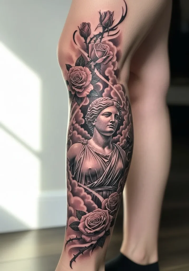 This elegant leg sleeve combines divine grace with timeless beauty. A classical statue of a Greek goddess stands among blooming roses, framed by soft clouds and delicate shading. The smooth textures of marble contrast beautifully with the natural softness of the petals, giving the tattoo a poetic and ethereal look.