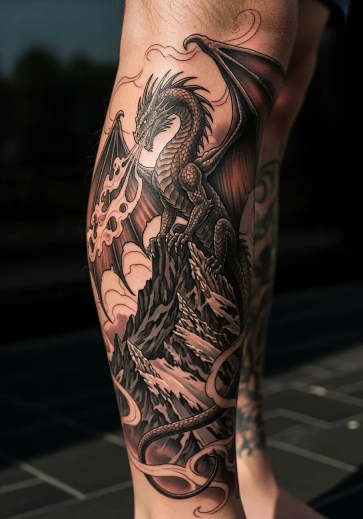 This dramatic leg sleeve features a dragon perched on a mountain peak, breathing fire into the clouds above. Shades of black, gray, and muted red bring the scene to life with a sense of heat and danger. The winding tail and smoky sky blend seamlessly with the contours of the leg, creating a powerful flow throughout the design.