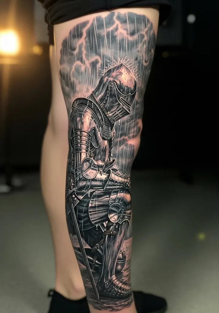 This piece shows a kneeling knight, drenched in rain under a stormy sky. The armor glistens with reflections of lightning, rendered in shades of silver and gray with subtle warmth peeking through the clouds. The composition follows the shape of the leg perfectly, giving it a somber yet heroic presence.