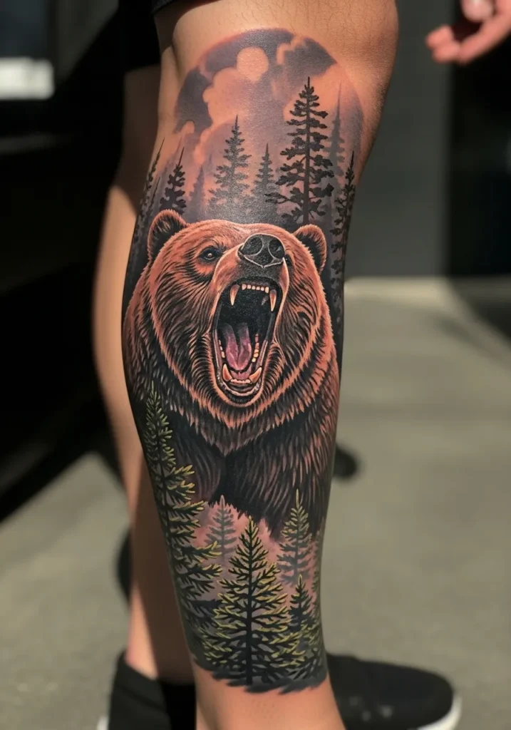 I love how this tattoo feels both wild and empowering. The bear s expression radiates strength, and the forest backdrop ties it all together beautifully. It s one of those designs that instantly commands respect and admiration.