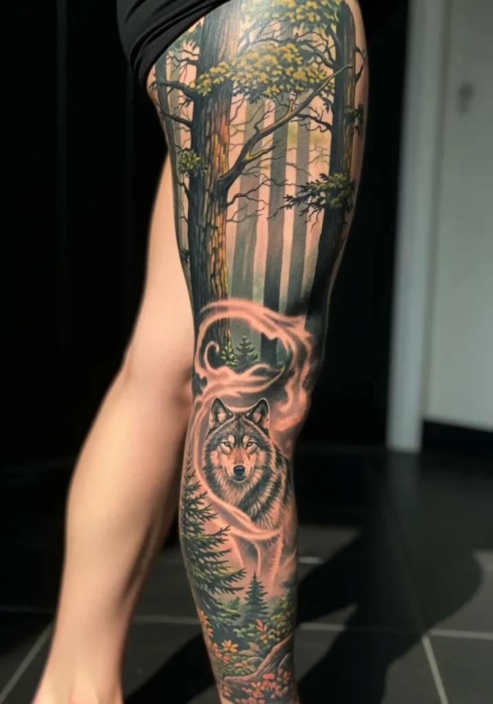 This leg sleeve showcases a breathtaking forest scene wrapping around the thigh and calf, brought to life in hyper-realistic detail. Tall pine trees fade into the misty background, while a majestic wolf stares forward through a swirl of smoke-like shading. The tattoo s earthy color palette of greens, browns, and muted oranges blends perfectly, creating a serene yet wild atmosphere that flows naturally with the leg s contours.