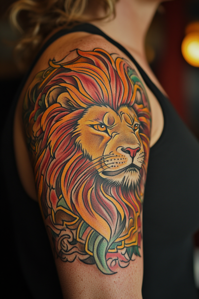 This stunning tattoo showcases the lion in a vibrant neo-traditional style, filled with rich, warm colors that give it life and depth. The lion s mane is a glorious mix of fiery reds, oranges, and yellows, flowing like flames and adding a dynamic sense of movement. The expression on the lion s face is both regal and calm, capturing that classic Leo confidence and strength. Bold outlines and subtle shading highlight the mane s texture, while intricate details bring out the lion s piercing gaze and dignified presence.