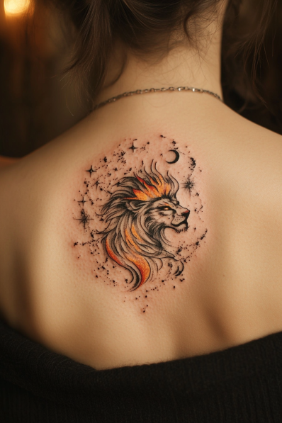 Cosmic Leo Tattoo with Fiery Highlights
