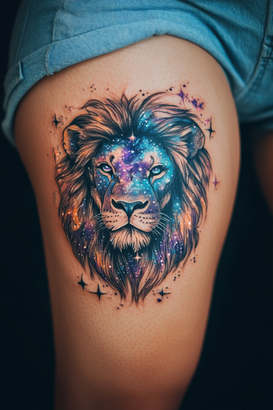 Cosmic Leo Tattoo with Vibrant Galaxy Effect