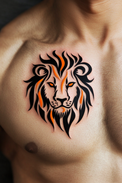 This fierce Leo tattoo combines tribal art with vibrant colors to create an unforgettable look. Bold black lines form the lion s mane, swirling outward in a way that resembles flames, while striking orange accents bring the whole piece to life. Those orange highlights not only add dimension but also give the tattoo an almost fiery aura. The lion s eyes are drawn in the same color, making it look like it s staring right into your soul. It s a design that feels alive, powerful, and full of energy.