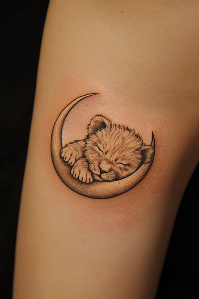 Sleeping Leo Cub Tattoo on a Crescent Moon