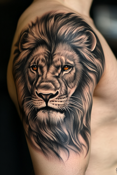 This tattoo embodies the spirit of the Leo sign, capturing the lion s essence with a hyper-realistic style that emphasizes every detail of the face and flowing mane. The intricate shading makes each strand of fur look almost alive, and those fierce golden eyes reflect the bold, confident energy Leos are known for. The design s depth and texture bring out the regal and powerful qualities associated with this star sign, making it a striking tribute to Leo pride.