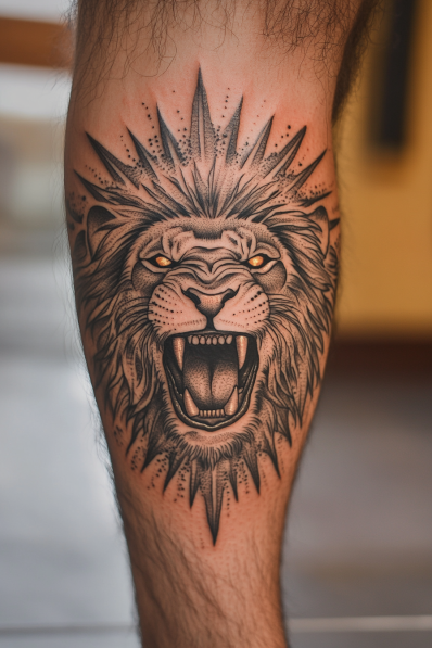 This tattoo takes the lion s powerful roar and amplifies it with radiant sun rays bursting from its mane. The lion s expression is fierce and intense, capturing that unmistakable Leo energy. The detailed line work in the mane combined with the surrounding sunburst effect gives the tattoo a look that s both majestic and wild. The shading around the eyes and mouth creates depth, making the lion s fierce expression even more captivating.