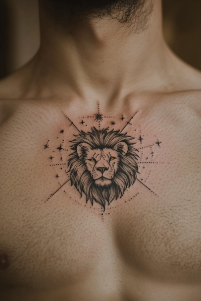 This refined Leo tattoo takes the majestic lion and surrounds it with a cosmic vibe, featuring delicate starry accents and fine lines radiating outward. The lion s face is skillfully detailed, with a calm and wise expression that contrasts beautifully against the subtle celestial background. Stars and lines create a soft, almost mystical halo around the lion, giving it a regal yet serene aura. The chest placement only adds to its impact, making it feel like a heart-centered symbol of inner strength and cosmic energy.