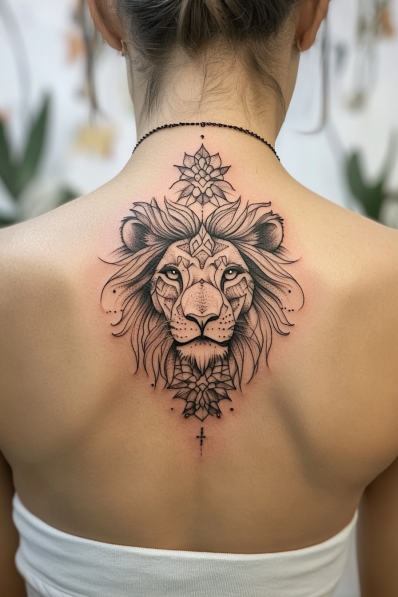 This stunning tattoo merges the majestic lion with intricate mandala elements, giving it an almost spiritual vibe. The lion s calm yet intense gaze anchors the design, surrounded by delicate mandala patterns that extend above and below, adding balance and symmetry. The flowing lines in the mane blend effortlessly with the ornamental mandala details, creating a seamless look that s both powerful and graceful. The placement down the spine only adds to the elegance, making it feel like a personal emblem of strength and serenity.