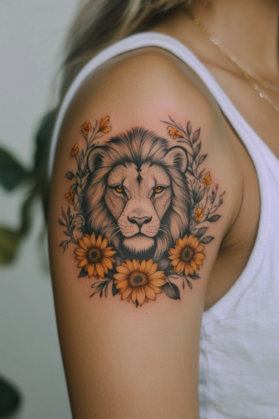 This beautiful tattoo combines the strength of a lion with the soft elegance of sunflowers, creating a look that s both fierce and gentle. The lion s face is detailed with careful shading that gives it a regal and focused expression. Framing the lion are vibrant orange sunflowers and delicate leaves, adding warmth and a touch of nature to the design. The floral accents soften the intensity of the lion, making it feel like a harmonious blend of power and grace.