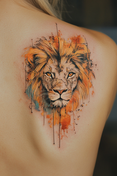 This bold tattoo combines the fierce lion symbol with a splash of watercolor artistry, creating a captivating, painterly effect. The lion s intense gaze is framed by vibrant strokes of orange and subtle hints of blue, adding a fiery yet serene energy to the design. The loose, abstract splashes give it a dynamic feel, as if the lion is emerging from a burst of color. Thin black lines and dots accentuate the artwork, bringing balance to the chaos of color and giving it a structured, almost mixed-media look.