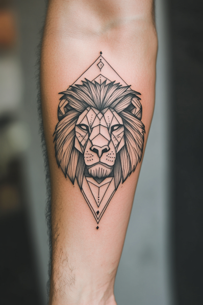 I ve got to say, this tattoo is seriously cool. The geometric style gives the lion an edgy, contemporary vibe without losing its symbolic strength. It s like a classic design, but with a twist that makes it feel fresh and unique. For anyone who loves the Leo sign or just digs powerful animals with a modern twist, this one is a winner. Plus, the geometric elements make it look almost hypnotic kind of hard to look away, honestly!