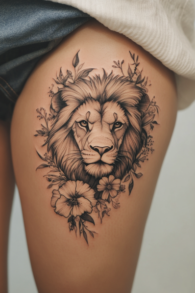I love how this design mixes strength with elegance. The flowers make the lion feel approachable and almost nurturing, like a protector of nature. It s perfect for anyone who sees their Leo traits as more than just fierce but also deeply caring and connected to the natural world. This tattoo would look amazing on someone who values both power and beauty in equal measure. It s subtle yet striking, the kind of tattoo that tells a story without needing to roar.