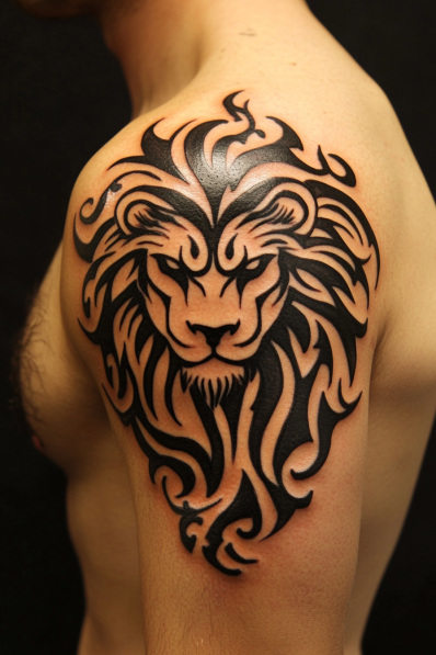 This tattoo brings the powerful lion to life through bold tribal lines and intricate symmetry, creating a design that s as fierce as it is visually striking. The lion s face emerges through thick black swirls and sharp curves, with the mane flowing in a wave-like pattern that enhances its intensity. The black ink fills give it a solid, almost armor-like appearance, while the tribal style lends a timeless feel. It s a tattoo that exudes strength, balance, and resilience, perfect for anyone who connects with their inner Leo.