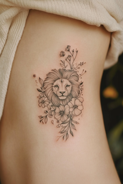 Floral Leo Tattoo with Soft Botanical Accents