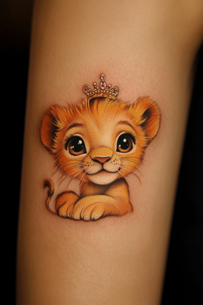 This tattoo is pure cuteness overload, featuring an adorable baby lion with big, innocent eyes and a tiny crown perched on its head. The lion cub s expression is sweet and playful, with a soft orange and golden color palette that adds warmth to the design. The little crown adds a charming touch, giving a nod to the regal nature of the Leo sign but with a cute twist. It s a design that s as endearing as it is eye-catching, perfect for those who want a softer take on the traditional lion tattoo.