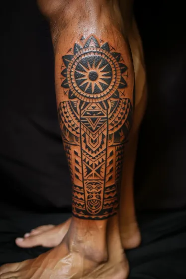 This Polynesian leg tattoo commands attention with its bold sun motif at the top, radiating strength and energy. Below, an intricately detailed warrior figure takes center stage, framed by traditional geometric patterns. The contrast between thick black ink and delicate negative space makes each symbol pop, giving it a powerful yet harmonious look.