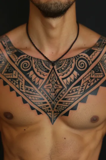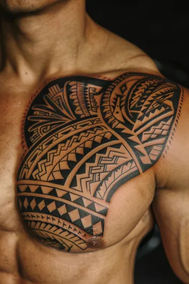 Polynesian Chest Tattoo with Bold Geometric Flow