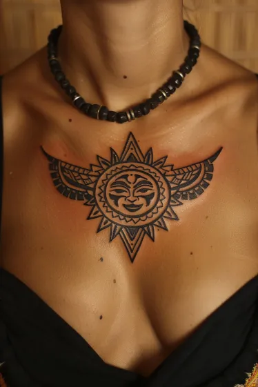 Polynesian Chest Tattoo with Feminine Tribal Patterns