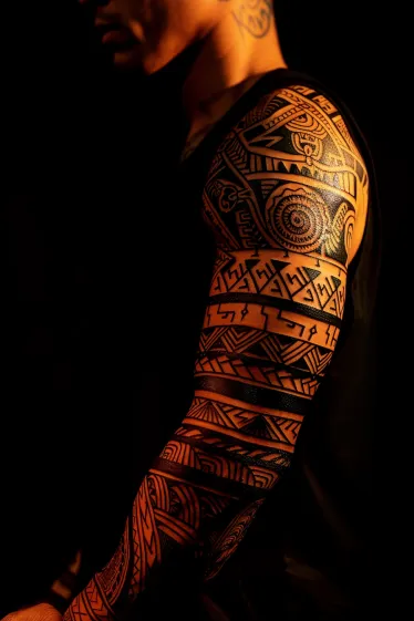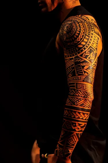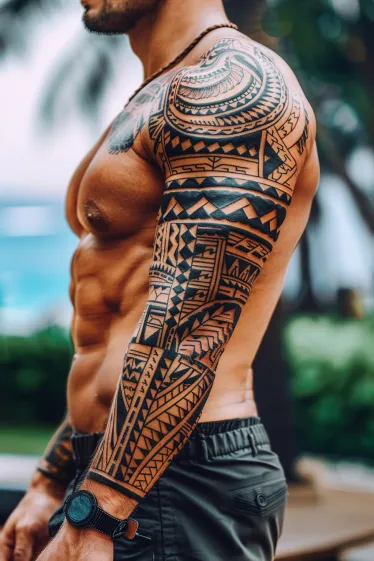 Polynesian Full Sleeve Tattoo with Intricate Linework