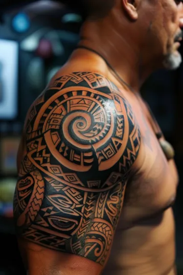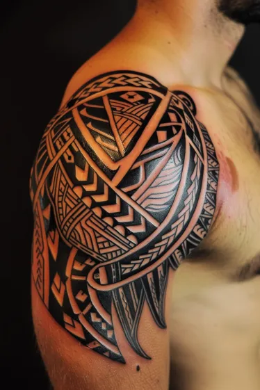 Polynesian Shoulder Tattoo with Bold Flowing Patterns