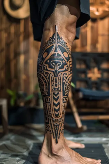 Polynesian Calf Tattoo with Spearhead Symbolism