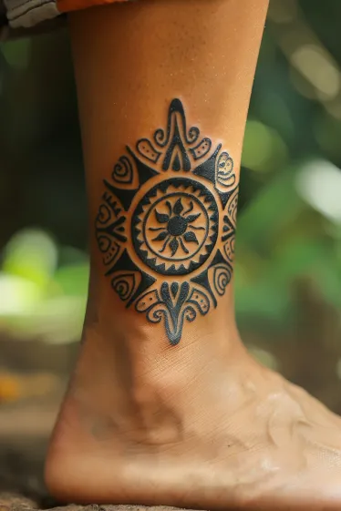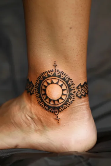 This Polynesian ankle tattoo is a stunning mix of symbolism and style. The bold sun motif sits at the center, representing strength, life, and guidance, while the surrounding tribal band encircles the ankle in a seamless flow of intricate patterns. The negative space in the sun s center adds a unique touch, making the design feel almost like an ancient talisman worn with pride.