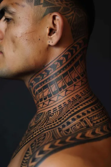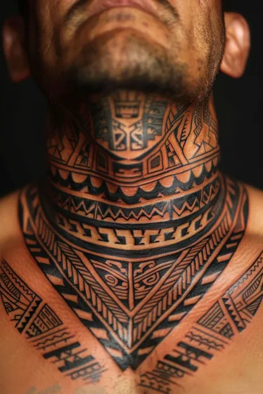 Polynesian Neck and Chest Tattoo with Warrior Symbolism
