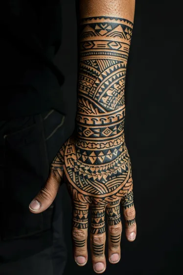 This Polynesian hand and forearm tattoo is a masterpiece of cultural artistry. The intricate geometric patterns and curved motifs seamlessly wrap around the wrist and extend over the hand and fingers. The design is bold yet balanced, combining traditional tribal elements with modern precision. The symmetry and flow of the tattoo enhance the natural contours of the hand, making it look both structured and organic.