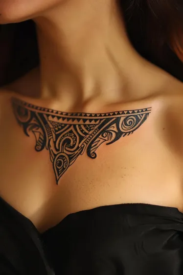 This Polynesian chest tattoo is an absolute stunner. The delicate yet bold triangular design perfectly follows the natural shape of the collarbone, creating an effortlessly elegant look. The intricate tribal swirls and geometric elements add depth, while the sharp black ink contrasts beautifully against the skin. Every curve and line seems to flow together, making this piece feel both artistic and deeply symbolic.