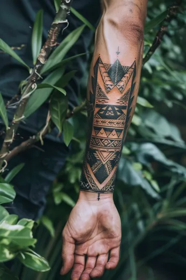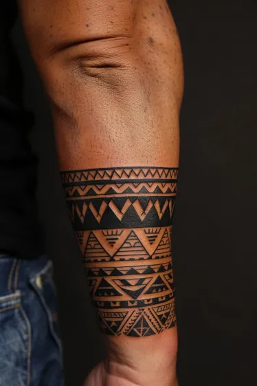 This Polynesian forearm band tattoo features a bold geometric pattern, with repeating triangular and chevron motifs that wrap seamlessly around the arm. The symmetry and balance of this design give it a striking yet structured appearance, making it a perfect choice for those who appreciate clean, sharp lines with deep cultural significance. The mix of solid black ink and negative space creates a beautiful contrast, emphasizing the intricacy of the traditional Polynesian motifs.
