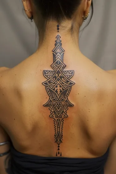 This Polynesian spine tattoo is the definition of graceful and fierce. The long, dagger-like structure running down the spine gives it a regal, almost armor-like presence, while the intricate tribal elements woven into the design add a delicate, feminine touch. The sharp geometric accents and symmetrical flow make it feel balanced and intentional, as if it was designed to complement the natural curve of the back. The way it extends from the nape of the neck to the lower spine creates a bold yet elegant statement.
