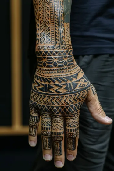 Polynesian Hand and Finger Tattoo with Intricate Tribal Patterns